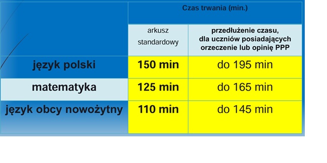 Arkusz dla cudzoziemców przewiduje wydłużenie czasu na języku polskim (do 195 min.) i matematyce (do 165 min.). Czas na rozwiązanie arkusza egzaminacyjnego z języka obcego nowożytnego to 110 min.